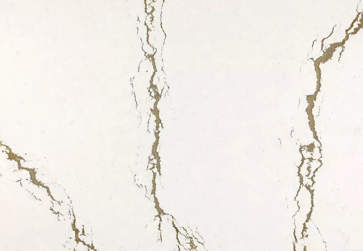 Berkshire Brass Sculpted features softly textured brass veins and delicate gray accents that jet across a cool, marbled white background. This sophisticated surface offers a tactile, modern appeal and a chic aesthetic that complements design styles ranging from traditional to contemporary. Known for exceptional durability and a nonporous, maintenance-free finish, it provides a timeless look for high-use areas like kitchen countertops and vanities without the need for regular sealing.